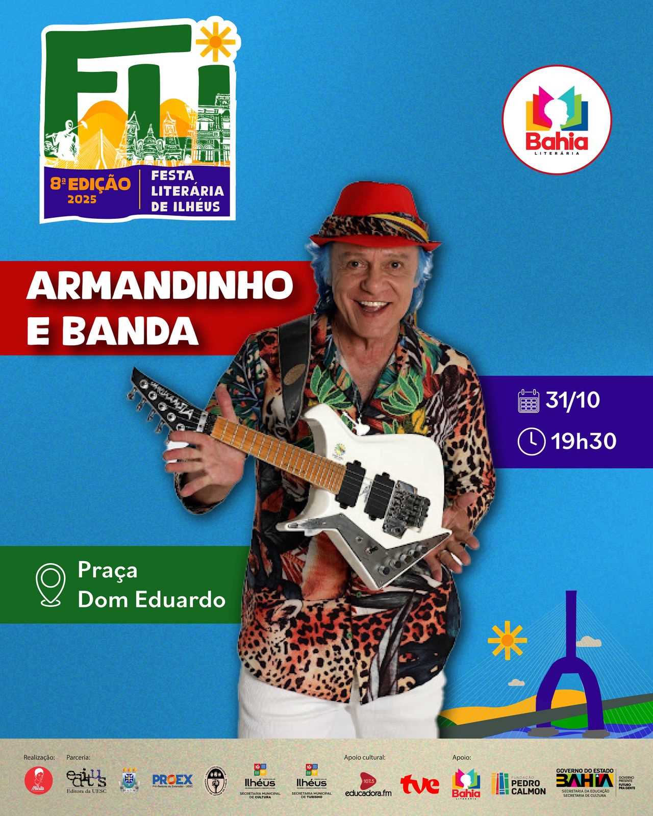 A Universidade Estadual de Santa Cruz (UESC), a Comunidade Tia Marita e a Fundação Pedro Calmon da Secrataria de Cultura da Bahia realizam, com o apoio da Prefeitura de Ilhéus, o encerramento do Mês do Livro e da Leitura, com um show gratuito de Armandinho e Banda, nesta sexta-feira (31), a partir das 19h30, na Praça Dom Eduardo, no Centro.