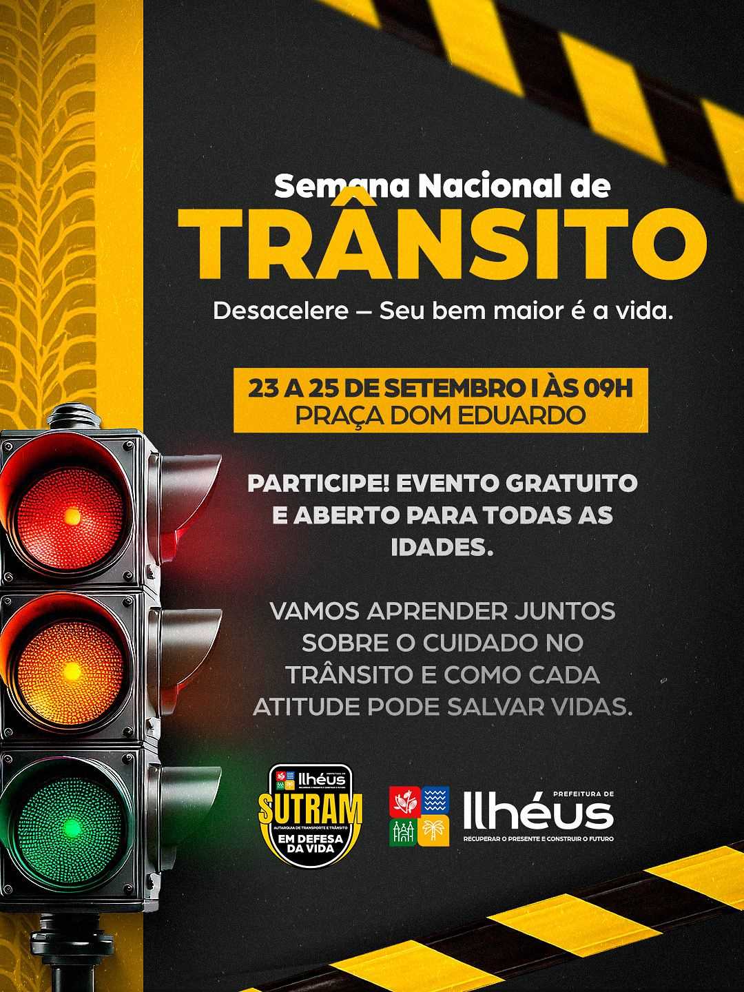 A Prefeitura de Ilhéus, por meio da Autarquia de Transporte, Trânsito e Mobilidade (SUTRAM), realiza, entre os dias 23 e 25 de setembro, a Semana Nacional de Trânsito 2025, com o tema “Desacelere – Seu bem maior é a vida”. As atividades acontecem a partir das 9h, na Praça Dom Eduardo, e são abertas ao público.