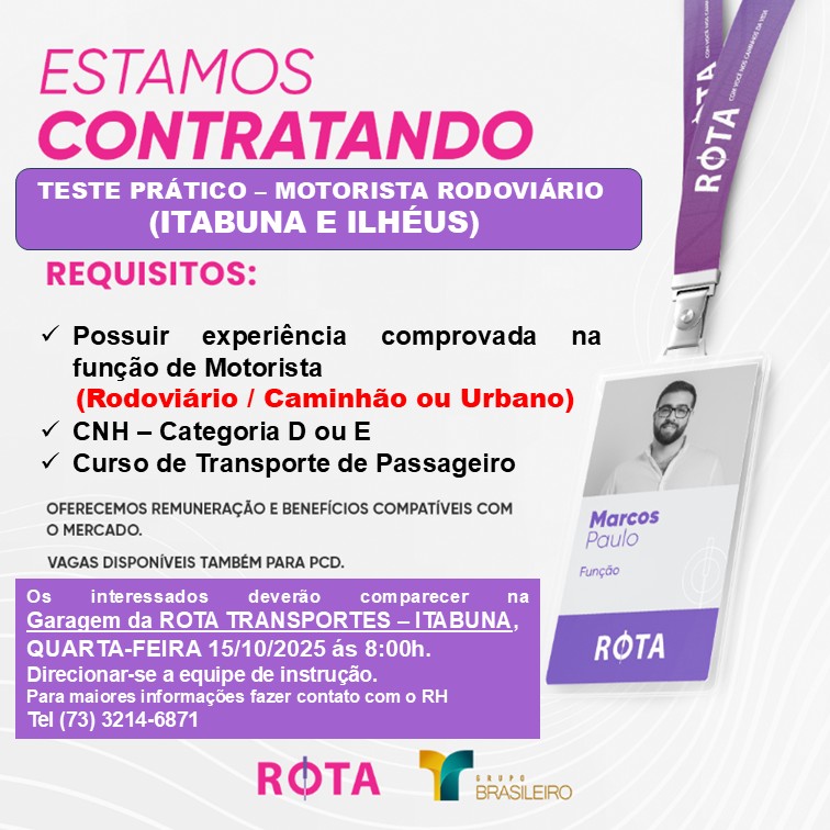 A Rota Transportes anunciou a abertura de 30 vagas para motoristas rodoviários, com oportunidades nas cidades de Itabuna e Ilhéus. O processo seletivo contará com um teste prático, marcado para esta quarta-feira, dia 15/10/2025, às 8h.
