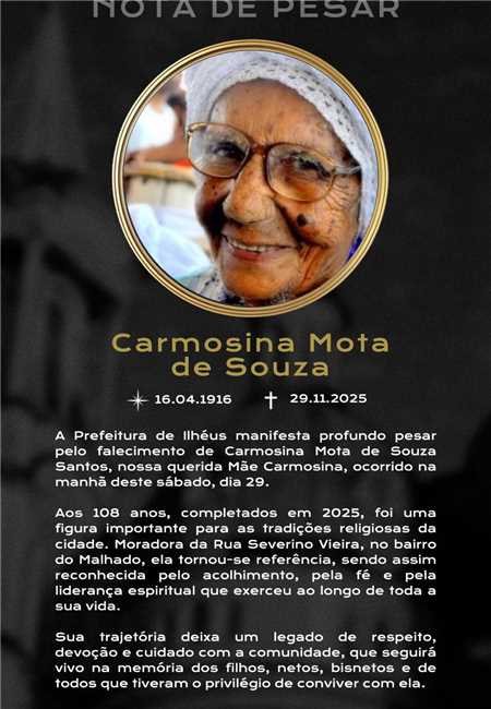 A Prefeitura de Ilhéus manifesta profundo pesar pelo falecimento de Carmosina Mota de Souza Santos, a querida Mãe Carmosina, ocorrido neste sábado (29).