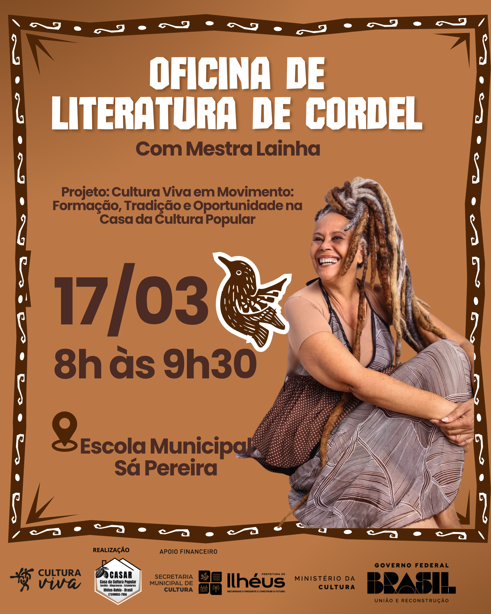 A Casa da Cultura Popular de Ilhéus (CASAR) realiza nesta terça-feira (17), a partir das 8h, uma programação formativa voltada para jovens com duas oficinas dedicadas à valorização das tradições da cultura popular brasileira. As atividades acontecem em Ilhéus. A primeira atividade do dia será a Oficina de Literatura de Cordel Afrocentrada, iniciando às 8h. Em seguida, às 9h40, será realizada a Oficina de Xilogravura, técnica artística tradicionalmente associada à estética dos folhetos de cordel.As duas oficinas serão ministradas pela Mestra Janete Lainha, fundadora da Casa da Cultura Popular de Ilhéus e uma das principais referências na preservação e difusão da cultura popular na região.